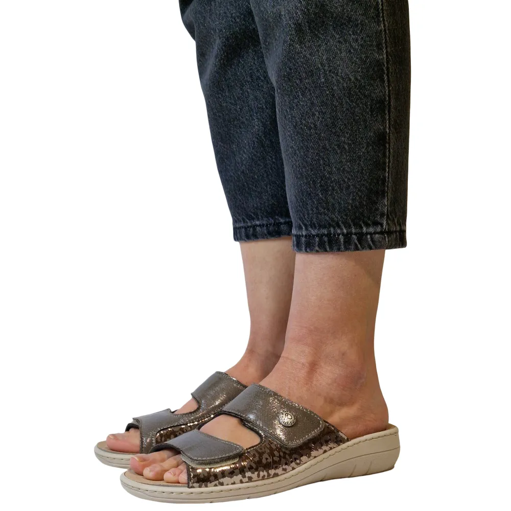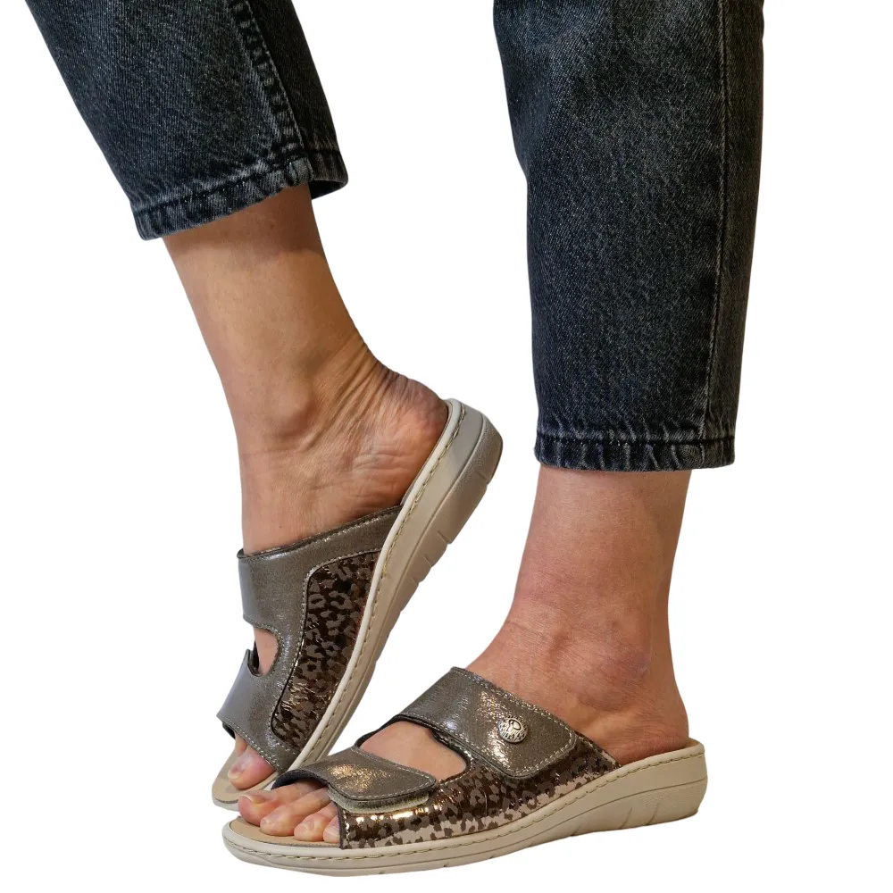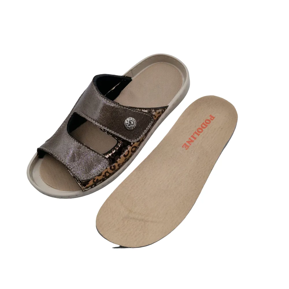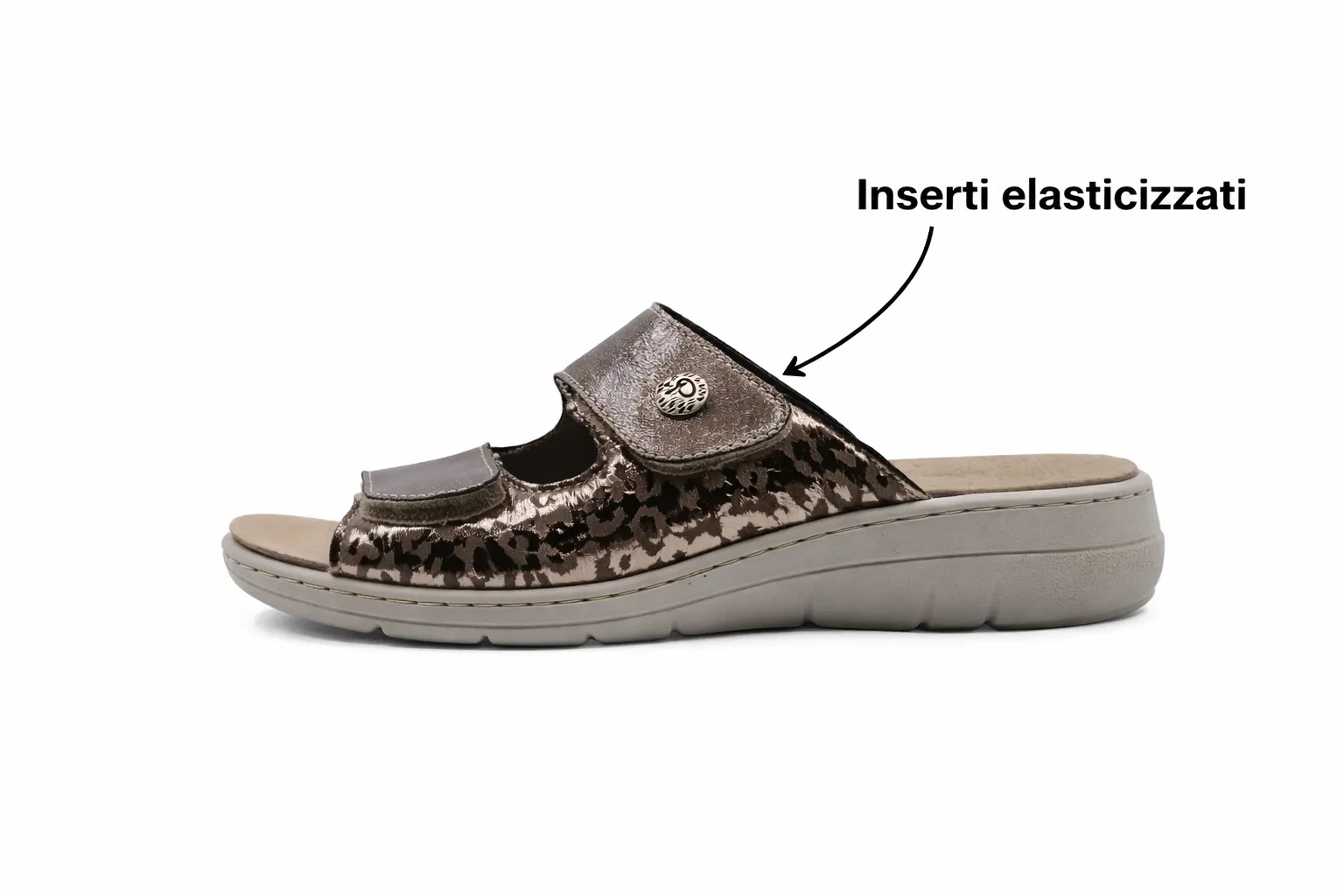 Uno dei punti di forza delle ciabatte donna per alluce valgo Podoline Zambana è la loro struttura studiata per offrire una calzata confortevole e meno stressante per il piede. La tomaia in ecopelle, arricchita da inserti laterali elasticizzati, si adatta con maggiore naturalezza alle deformità del piede come alluce valgo, dita sensibili e metatarsi larghi. Questo significa meno pressione nei punti critici e una sensazione di accoglienza che aiuta a vivere la giornata con più leggerezza.