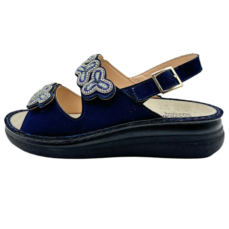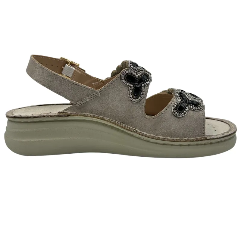 Realizzato in nabuk di alta qualità, questo sandalo conquista al primo sguardo grazie alle pietre decorative che aggiungono un tocco luminoso ed elegante. I velcri regolabili e il cinturino posteriore con fibbia assicurano una calzata personalizzabile, ideale anche in caso di gonfiore ai piedi.