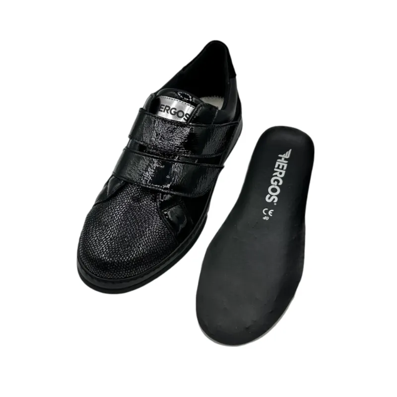 Scarpe donna Hergos H9621 con tomaia elasticizzata e plantare estraibile, adatte per dita a martello. Calzata L, tacco 3 cm e chiusura a doppio velcro per comfort e stabilità.